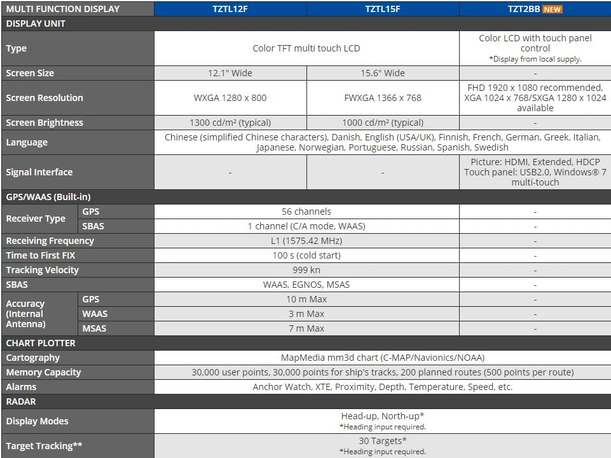 NavNet TZtouch2 15.6 "Çok İşlevli Ekran Harita Çizici ve Balık Bulucu Şık, tamamen ön cam yüze sahip, grafik kullanıcı arayüzü balık bulucu ve dahili GPS anteni NavNet TZtouch2 çok kullanışlıdır. Sıcak balık avlama alanları arıyorsanız, bir sonraki rotanızı çiziyorsanız veya Radar'ınızı siste gezinmek için kullanıyorsanız, TZtouch2 tanıdık dokunma hareketleriyle yumuşak bir çalışma sunar. Sportif ve uçtan uca cam ön yüze sahip NavNet TZtouch2, yalnızca işlevsel değil aynı zamanda lüks bir görünüm ve his sağlayan bir gezinme süiti oluşturmanıza olanak tanıyan güzel bir şekilde tasarlanmıştır. Orijinal NavNet TZtouch'un izinden giden TZtouch2 tamamen kullanılabilirlikle ilgilidir - yeni rafine edilmiş grafiksel kullanıcı arayüzü kullanımı çok kolaylaştırıyor! Ana ekran simgesine dokunarak ya da "Kenar Kaydır" hareketini kullanarak farklı ekranlara erişebilirsiniz. Sol kenardan kaydırmak, gezinmeyi ve harita kullanımını basitleştirmek için içeriği özelleştirebileceğiniz NavData panelini ortaya çıkarır. Buradan Otomatik Pilotu ayarlayabilir, gelgit bilgilerini kontrol edebilir ve çok daha fazlasını yapabilirsiniz. Ekranın altından yukarı kaydırmak, daha derindeki menü sistemlerine girmeye gerek kalmadan anında ayarları değiştirmenin pratik bir yolu olan Katmanlar menüsünü ortaya çıkarır. Ekran her zaman görünür kaldığından, ayarların değiştirilmesi artık her zamankinden daha kolay. Ekranın üst veya sağ tarafından kaydırarak kullanılabilir olduğunda benzer, bağlamsal işlevler vardır. Dahili Balık Bulucu, çift frekanslı (50 / 200kHz), 600W / 1kW güç çıkış sirenidir. Furuno'nun benzersiz Alt Ayırım ve AccuFishTM modlarını içerir ve ayrıca RezBoost ™ adı verilen yeni bir Furuno tescilli Balık Bulucu teknolojisini de içerir. RezBoost ™, dönüştürücünüzü değiştirmek veya pahalı genişbant dönüştürücüler satın almak zorunda kalmadan, fantastik hedef çözünürlük ve ayırma üretmek için Furuno'nun özel dijital sinyal işleme protokolünü kullanan devrim niteliğinde yeni bir özelliktir. RezBoost ™ ile, daha önce Furuno ticari sınıf Balık Bulucuları ile sınırlı olan hedef ayırma ve çözünürlüğü elde edebilirsiniz. Ekranda 56 kanallı Furuno GPS Alıcısı bulunmaktadır. Yedeklilik için harici bir anten bağlayabilirsiniz, ancak birincil GPS alıcısı yerleşiktir. Dahili Fish Finder ve GPS alıcısı ek donanım ve kurulum maliyetlerinden tasarruf etmenizi sağlar. NavNet TZtouch2, Furuno'nun ödüllü ağ ürünlerini kullanan, bileşen tabanlı bir sistemdir. 4kW Kubbeden 25kW Açık Diziye kadar çeşitli UHD Radarları ekleyebilirsiniz. NavNet TZtouch ile olduğu gibi, NavPilot Otopilot ve Furuno'nun FI70 Enstrümanını entegre edebilir, görüntüleyebilir ve kontrol edebilirsiniz. Bu ürünlerin her ikisinde de TZtouch2 ile eşleşen ekranlar bulunur ve dümene güzel bir cam kaplama sunar. Ağa eklenebilecek ilave sensörler arasında AIS, Hava Durumu Faks, Sirius / XM Uydu Hava Durumu, Fusion Marine Stereo ve IP Kameralar, NMEA2000 ve Furuno CAN veri yolu aygıtları bulunur. Eski sistemlere veri göndermek için bir NMEA0183 çıkış portu bile içeriyor. NavNet TZtouch, tabletlere ve akıllı telefonlara WiFi üzerinden erişebilme özelliğini tanıttı ve TZtouch2 bu yeteneğini sürdürüyor. TZtouch2 ekranınızla kullanmak için hem Apple hem de Android cihazlar için birkaç ÜCRETSİZ uygulamayı indirebilir ve kullanabilirsiniz. Kalabalık kaynaklı ilgi çekici yerler sunan ActiveCaptain hizmetine, kullanıcıların derinlik, engeller vb. Gibi değişiklikleri rapor etmelerine izin veren Topluluk Grafikleri ve son olarak da izin verecek bir TimeZero ™ Bulut Veri Hizmeti de dahil olmak üzere daha fazla kablosuz özelliği yakında geliyor. TimeZero ™ cihazlarınızdaki verilerinizi yedeklemenizi ve senkronize etmenizi sağlar. Özellikler: